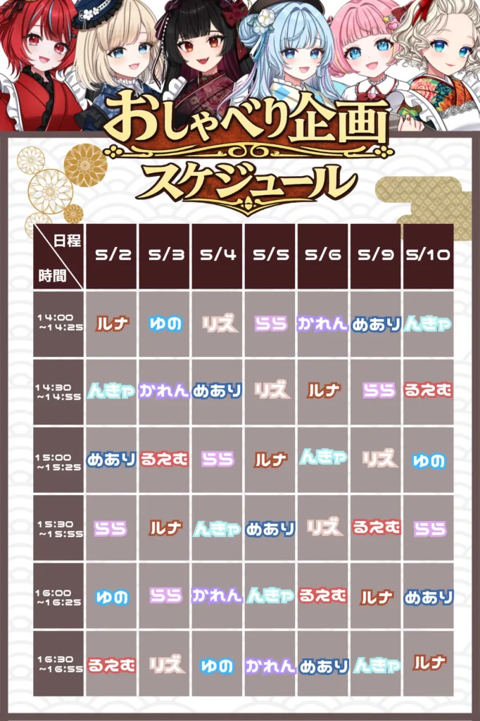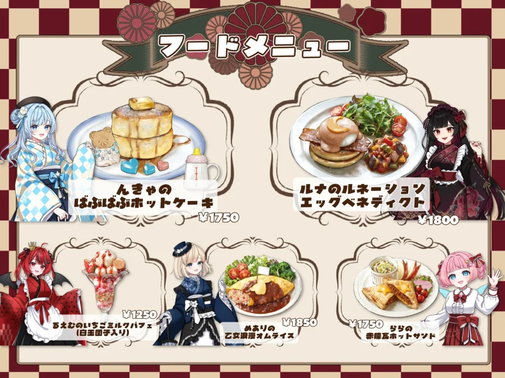 開催時期 開催場所 給仕ライバー一覧 コラボカフェメニュー 限定グッズ 運営企業 開催時期 開催場所 給仕ライバー一覧 コラボカフェメニュー 限定グッズ 運営企業 CORECATIS VIRTUAL PROJECT コラボカフェが開店決定!かわいい店内装飾にオリジナルメニュー、等身大パネルも設置!ぜひ楽しみに開店をお待ちください🎶 開催時期 開催期間2026年4月29日(水)〜5月10日(日) 営業時間12:00〜19:00(L.O.18:00)*営業時間前は 店舗前にお並びいただけませんのでご了承下さい。 開催場所 場所:Vtuber Cafe(BLUE PIECE 新宿のボードゲームカフェ跡地)住所:〒160-0007 東京都新宿区荒木町16-16 ベルウッドビル2階 給仕ライバー一覧 水瀬んきゃ 月守ルナ 雲母らら 柊めあり 藤和リズ 夕凪るえむ コラボカフェメニュー ◼注意事項 ・当日の仕入れ状況によって、メニューの仕様が一部変更になる可能性がございます。・ご注文状況次第にはなりますが、提供されるプレートやグラスが変更になる可能性がございます。・オリジナルメニューのフードをご注文いただいたお客様にはランチョンマットをプレゼントさせていただきます。・オリジナルメニューのドリンクor通常ドリンクメニューをご注文いただいたお客様にはコースターをプレゼントさせていただきます。・クリームソーダーをご注文いただいたお客様にはSDアクリルキーホルダーをプレゼントさせていただきます。・コースターとランチョンマットについて、どのライバーのものが欲しいかご希望がありましたら、お気軽にスタッフまでお声がけください。・コースターとランチョンマットは各ライバー分、余裕を持ってご用意しておりますが無くなり次第配布は終了とさせていただきます。 オリジナルグッズ ◼注意事項 ・モックアップデータはあくまで見本ですので仕様が若干異なる商品がございます。・店舗スペースの関係上ストック出来る在庫に限りがございます。なくなり次第終了になりますので、ご了承下さい。・在庫がある商品に関してはECサイトで販売予定になりますので続報をお待ち下さい。・完売商品につきましては順次追加発注を行い、ECサイトでの販売を予定しております。ただし、追加発注分にも限りがあるため、無くなり次第終了とさせていただきます。・本企画はモバイルオーダーにて承ります。恐れ入りますが、QRコードよりグッズの選択・注文をお願いいたします。 ・コラボカフェメニューとオリジナルグッズの会計の合算が1万円(税込)を超えた方に先着で本イベント限定のクリアファイルをプレゼント致します。・店舗で購入したグッズを配送したい場合有料で承ります。 おしゃべり企画のスケジュール ◼注意事項 ・当日の運営状況によって時間が後ろ倒しになる可能性がございます。・店舗内で行うためライバーから出力される音声は他のお客様に配慮して、店舗にあるヘッドフォンかお客様の持参イヤホン(無線不可。有線(イヤホンジャック3.5mm)のみ)でご対応いたします。・混み具合によっては1名あたりの会話時間に制限を設けさせていただきます。・昨年に引き続き温かく迎えていただけると幸いです。がんばります! 運営企業 運営企業名 株式会社コレカティス 住所 東京都渋谷区桜丘町26-1 セルリアンタワー15階 代表者 高橋大樹